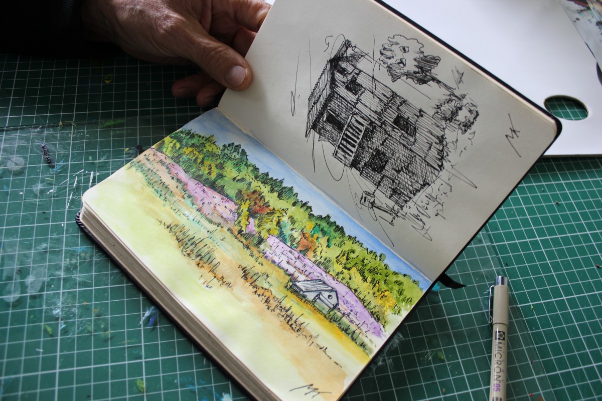 “Bij abstracte werken begin ik meestal van nul en heb ik vooraf geen duidelijk beeld in mijn hoofd van wat het moet worden. Ik laat me verrassen. Bij mijn aquarellen is dat inderdaad anders, daar laat ik me vaak inspireren door de natuur. Maar inspiratie kan overal opduiken en dus heb ik altijd mijn tekenschrift en een fineliner bij. Ik ben bijvoorbeeld gisteren nog met de mobilhome naar de keuring geweest. Daar stond een mooie auto binnen die ik wou tekenen, maar ik moest helaas te snel doorrijden.” (lacht)