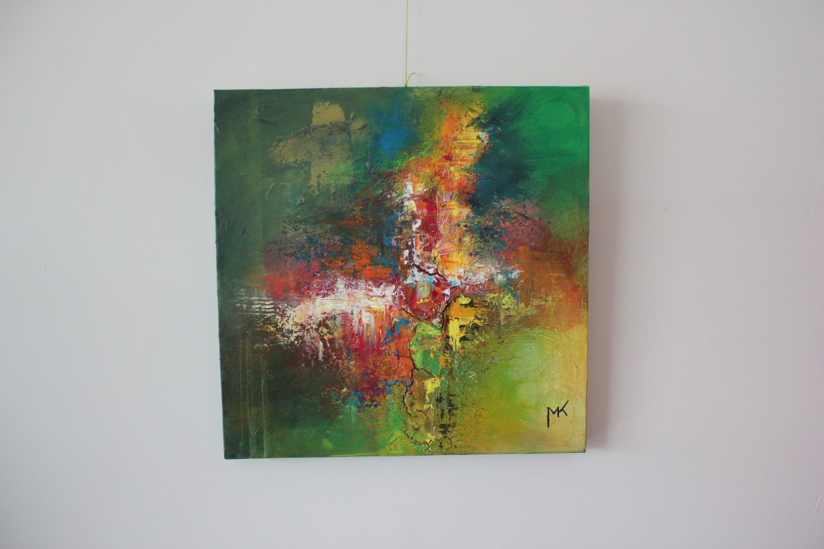 (Denkt na) “Ik heb spelen met kleuren altijd heel interessant gevonden. Ik meng niet op palet, altijd op mijn doek zelf. Zo kan je tot verrassende resultaten komen en zo weet ik zelf nooit hoe het eindigt. Ik hou ook van experimenteren met diktes en reliëf. Ik ben vrijwilliger in het afhaalpunt in de academie voor schone kunsten en daar zit ik aan de bron. Een heel fijne omgeving om in te vertoeven. Daar heb ik bijvoorbeeld pasta’s en poeders ontdekt waarmee ik aan de slag ben gegaan. Het kijken hoe en wanneer de verf dan breekt, vind ik prachtig. En je hebt dat niet in de hand, dat is een fijn gevoel.”