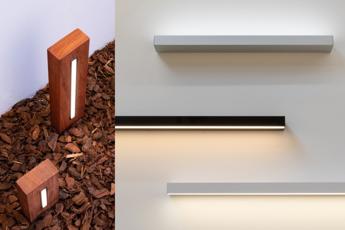 Daarnaast heeft Lichtkoning ook haar eigen productielijn die in hun atelier in Beerse wordt gemaakt. “Nieuw binnen ons eigen label is een wandlamp die we kunnen opbouwen tot vier meter lang, uit één stuk. Deze wandlamp kan je monteren als downlighter, waarbij het licht naar beneden schijnt, of als uplighter, waarbij het licht naar boven schijnt. Ook nieuw: we hebben voortaan een waterdichte versie van deze wandlamp die je bijvoorbeeld bovenaan de spiegel in de badkamer kan monteren.” Sinds kort biedt het eigen label ook tuinpalen van padoek aan. Daarbij heb je de keuze uit diverse modellen. “Waarbij we ons bij twee modellen hebben laten inspireren door onze populairste wandverlichting”, zegt Dennis.
