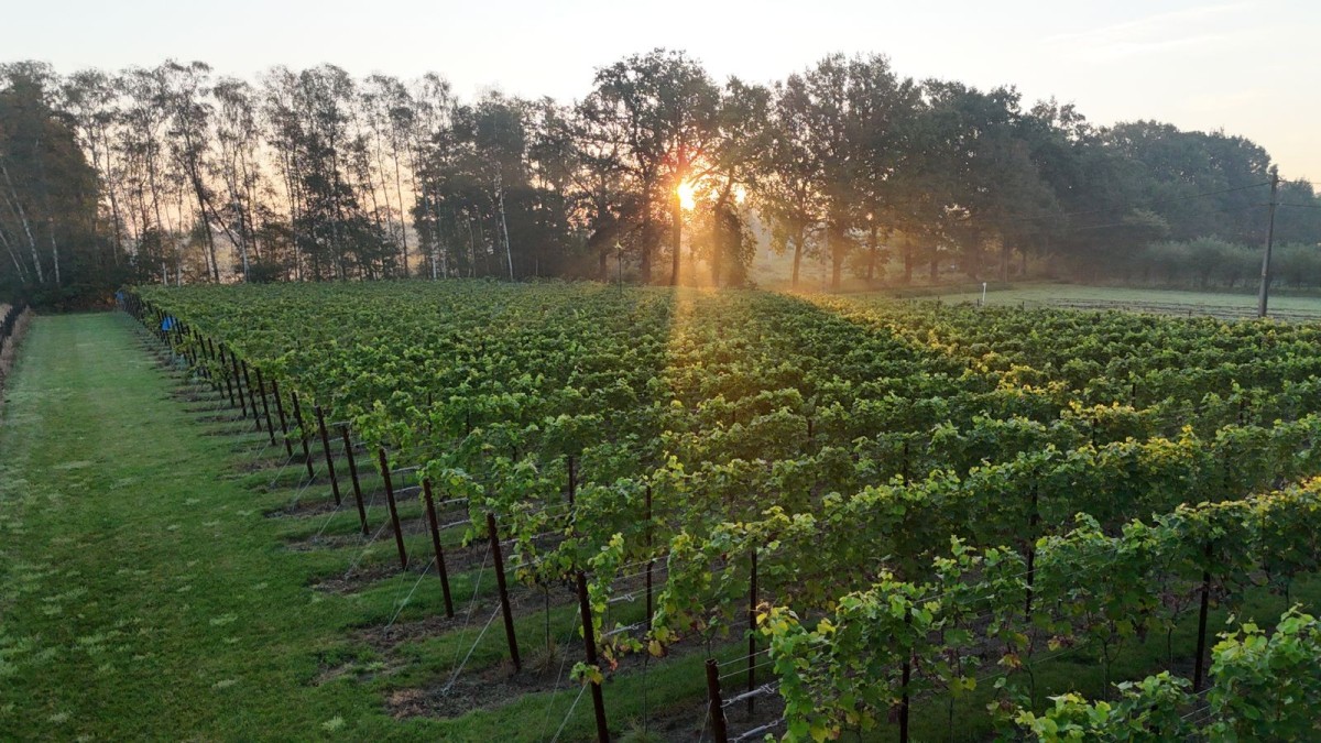 Voor Hans brengt de klimaatverandering voorlopig voordelen mee: warmere, drogere zomers helpen zijn druiven rijpen. “De Kempen zijn in de zomer vaak een paar graden warmer dan andere regio’s. Dat proef je.” Bij Valclegge ligt de uitdaging elders: late nachtvorst. “We beschermen de knoppen met een ijslaagje via beregening, dat net voldoende warmte vasthoudt.” In Poederlee ervaren ze vooral de grilligheid: warmere lentes, hevige regenpieken, langere droogtes. Daarom kozen ze voor robuuste rassen, focussen ze op bodemgezondheid en laten ze de natuurlijke dynamiek van insecten hun werk doen. Annick: “We hebben het geluk dat onze percelen omringd zijn door heggen en bomen. Dat zorgt voor biodiversiteit én een uniek microklimaat.”