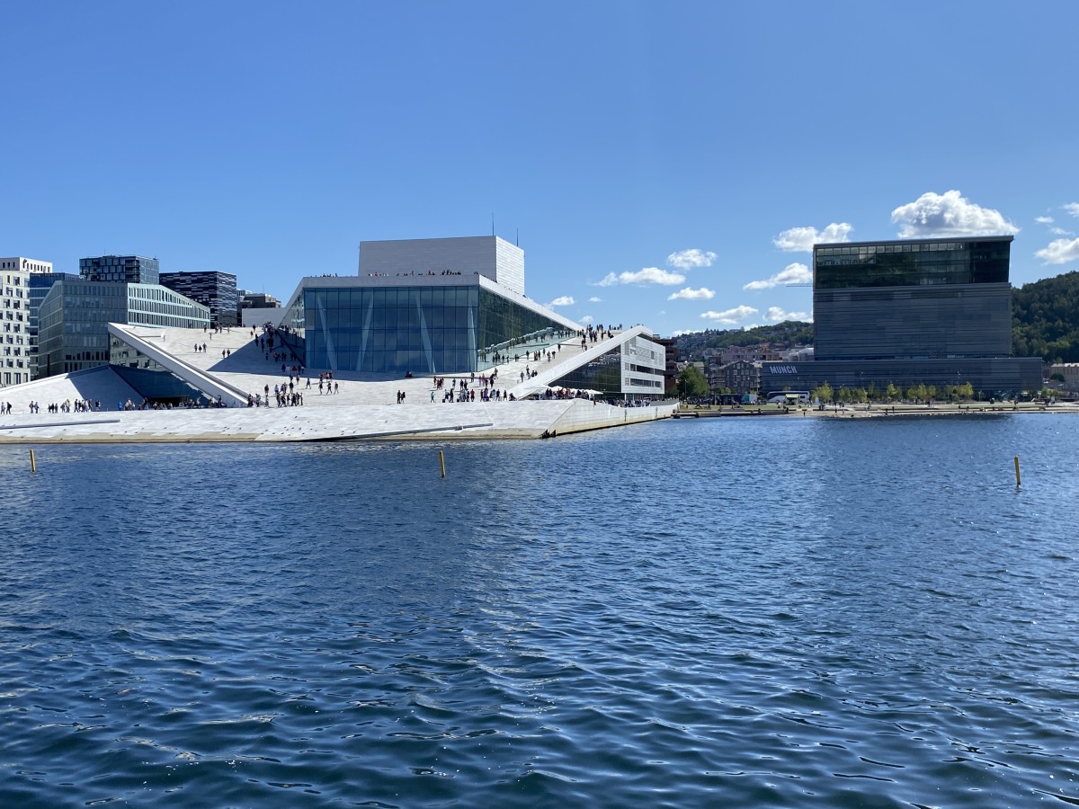 Op deze ochtend kies ik met het Operahuis een van de meest iconische gebouwen van de stad om mijn stadsverkenning te beginnen. ‘Kom van het dak af’, zong Peter Koelewijn, maar hier is het net de bedoeling dat je op het dak wandelt. Dat dak begint op straatniveau en via een hellend vlak klim je omhoog. Boven krijg je een spectaculair uitzicht over de stad: links de fjordenarchipel met kleurrijke zomerhuizen en rechts het hart van Oslo met daarachter heuvels en bergen.