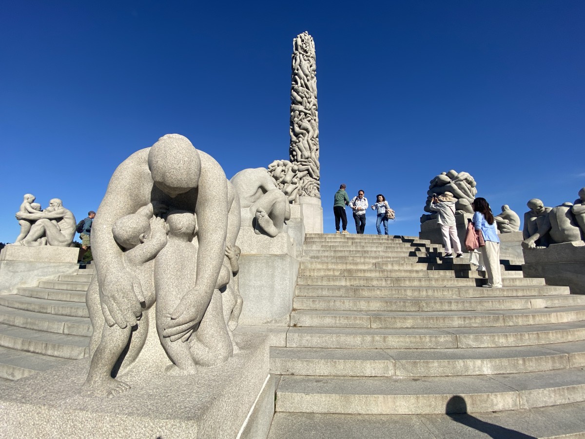 Met opzet vroeg in de ochtend wandel ik een dag later naar een andere groene long in de stad: het Frognerpark. Gelukkig ben ik zo vroeg, want wanneer ik het park een uur later verlaat, lossen autocars met Chinese en andere toeristen hun lading voor de toegangspoort. Die komen allemaal voor bijzondere beelden van beeldhouwer Gustav Vigeland, trouwens een tijdgenoot van Edvard Munch. Een deel van het park kreeg de naam Vigelandspark en telt meer dan tweehonderd bronzen, stenen en gietijzeren beelden van de kunstenaar. Het beeld Monolitten is een zuil van 17 meter die bekleed is met verschillende figuren. Dit is ’s werelds grootste beeldenpark gewijd aan één kunstenaar. Echt indrukwekkend. Aan de zuidkant van het park bevindt zich nog altijd het atelier van Vigeland, dat nu is ingericht als museum.