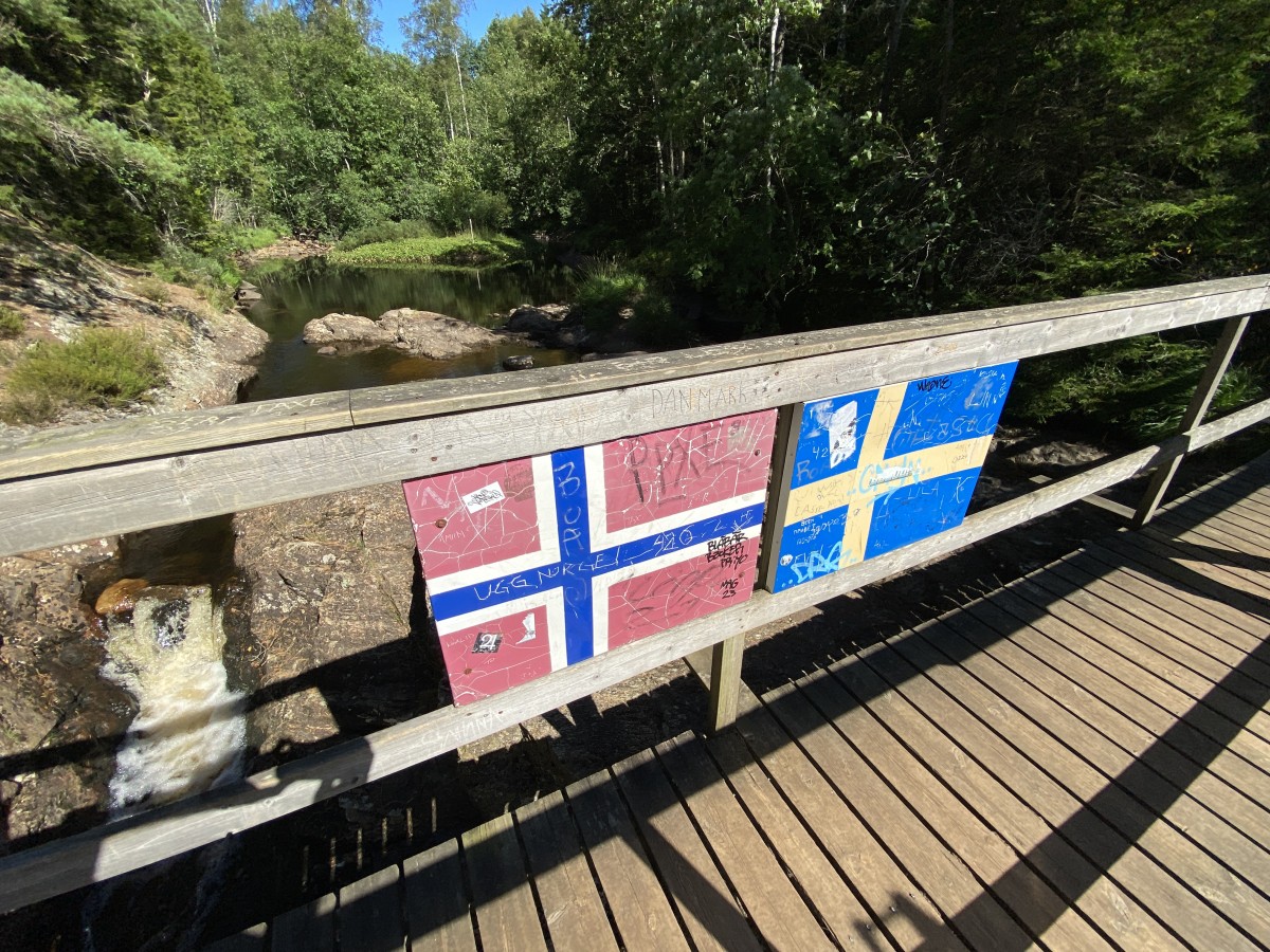 Ik parkeer de auto en trek de wandelschoenen aan. In de buurt van de waterval is een wandeling van een vijftal kilometer uitgezet. Dat vind ik nu eens een lekkere manier om een land binnen te komen. Al snel begint het goed begaanbare pad te klimmen en we passeren zelfs een heidegebied. Het is midden augustus en de heide staat ook hier mooi in bloei. Eenmaal boven maken we nog een lus en komen zo op het hoogste punt van de waterval. Die wordt gevoed door een traag stromende beek die je via een houten bruggetje kunt oversteken. De beek vormt meteen ook de grens. Om dat duidelijk te maken hangen tegen de brug borden met de landenvlaggen: links Noorwegen en rechts Zweden.