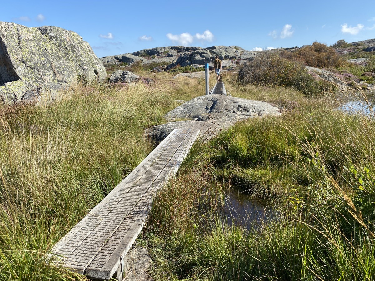 Omdat we toch in de buurt zijn, en omdat mijn reisgezelschap er niet eerder was, wil ik hen mijn favoriete eilandengroep in de streek tonen. Vanuit de Lilla Varholmens Veerterminal varen gratis knalgele ferry’s op en af naar de Öckerö-eilanden, een archipel voor de kust van Göteborg, de grootste havenstad van Scandinavië. We kiezen voor het vaartuig naar Öckerö zelf, het hoofdeiland. Twee jaar geleden fietste ik al over de eilandengroep waarvan de eilanden met mekaar zijn verbonden door bruggen. Nu wandelen we een stuk van de Kuststigen Bohuslän, een 376 km lang wandelpad tussen Göteborg en Oslo. De lange-afstandswandelweg is opgedeeld in verschillende etappes en de archipel van Göteborg krijgt van de makers een speciale vermelding omwille van de schoonheid van het gebied.