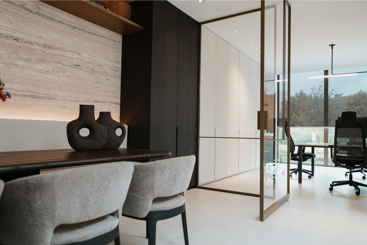Via de glazen deuren en grote raampartijen valt er veel natuurlijk licht binnen in het kantoor. “Omdat het zo een fijnere werkomgeving is, maar ook omdat die keuzes meestal in moderne woningen gemaakt worden. Belangrijk, want we hebben ons bewust in een woonomgeving gevestigd en niet in een industriezone. En dus moest het uiterlijk van het belevingskantoor ook echt dat van een moderne woning zijn. Dat betekende ook dat het interieur dicht bij dat van een huiselijke omgeving moest aanleunen.”