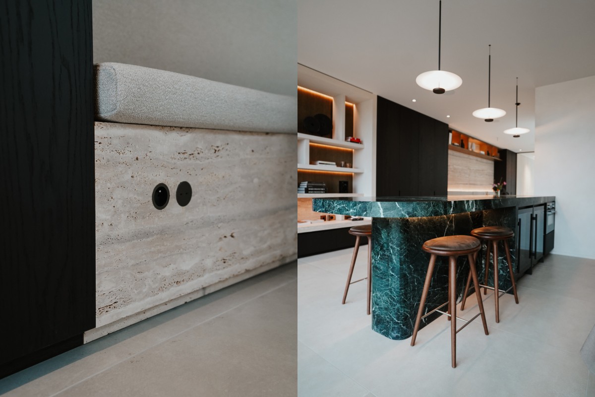 Het interieur en het maatwerk moest strak zijn, met veel rechte lijnen. “Dat is mooi en tijdloos. En dus waren de details cruciaal. De greepjes met kleine uitsparingen om de kasten te openen bijvoorbeeld. En de ingebouwde stopcontacten overal. Zowel in de natuursteen als in de kasten zelf. In de natuursteen zijn we bewust op zoek gegaan naar de kleur van de steen zodat de stopcontacten nauwelijks opvallen.”