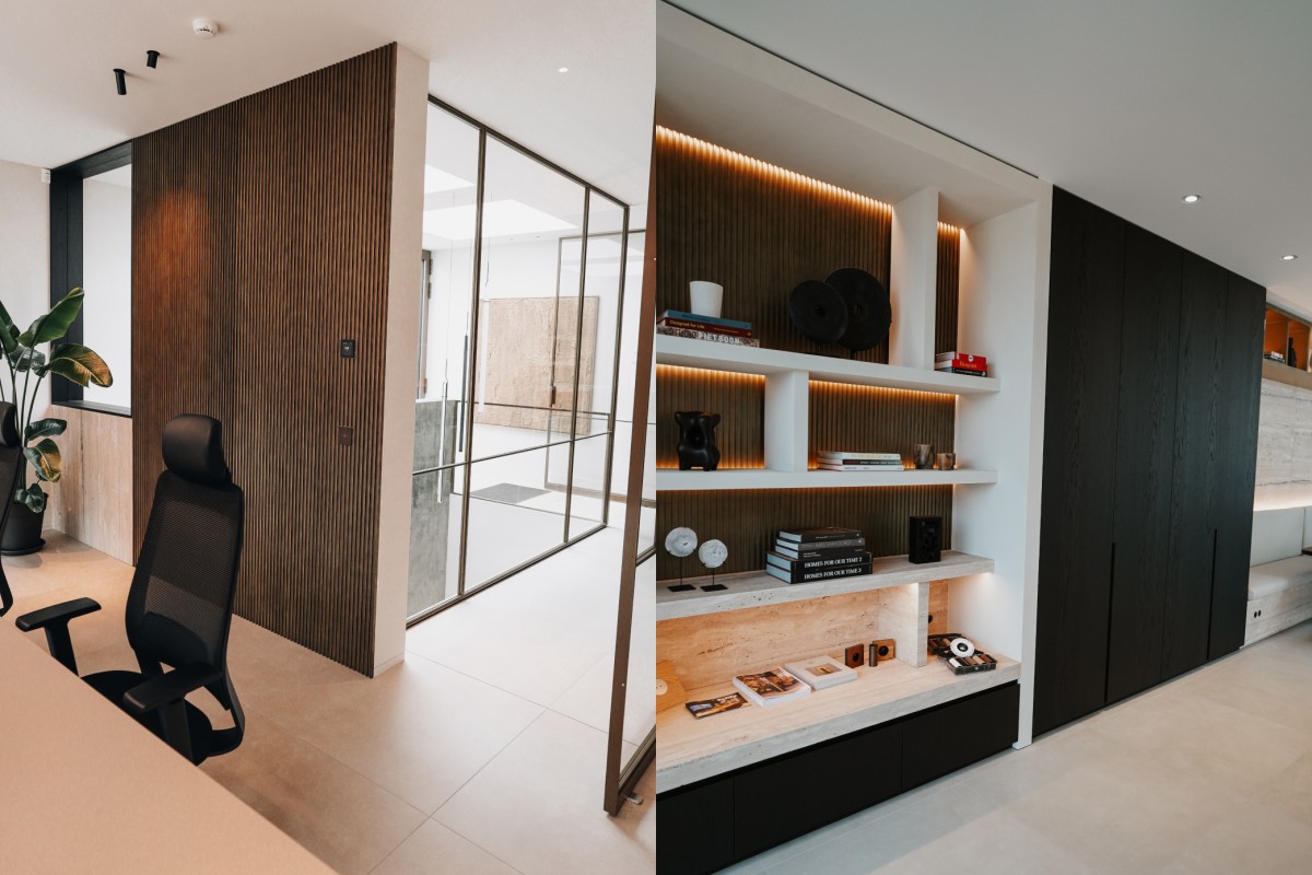 “Wij zijn hier met technieken bezig, maar het maatwerk daarrond is enorm belangrijk”, vertelt Robin, die ons rondleidt in het kantoor van zijn zaak WeKonnekt. “Wij verzorgen technische installaties binnen een bouwproces. Alles wat mogelijk is, wilden we onder één dak samenbrengen. Maar dan wel zonder er een traditionele showroom van te maken.” En dus schakelden ze interieurinrichter Boa Interior uit Kasterlee in om dat maatwerk mee uit te denken en te realiseren. “We hebben hen via-via leren kennen en hadden vooral gehoord dat hun kwaliteit van afwerking heel erg hoog lag. Goede bouwpartners zoeken is essentieel als je een mooie en praktische woning wil.”