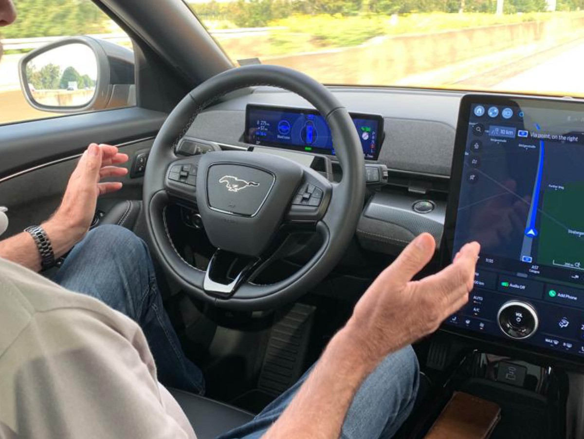 Het voelt wat onwennig indien u wordt opgedragen om astrant te zondigen tegen instructies die je al vijftig jaar consequent probeert na te leven. “Nooit het stuurwiel loslaten!” klonk het altijd. En al zeker niet op een drukke snelweg. Je mag dan overtuigd zijn van het onbeschrijfbare ‘kunnen’ van moderne elektronica, een technische discipline die ons ver van vreemd is. Het helpt niet. De eerste kilometers ‘handenvrij’ rijden met een Ford Mustang Mach-E in BlueCruise-modus, pompen onze stressmeter gevaarlijk diep in de rode zone. En dat is nu net wat innovatieve rijhulp moet voorkomen.