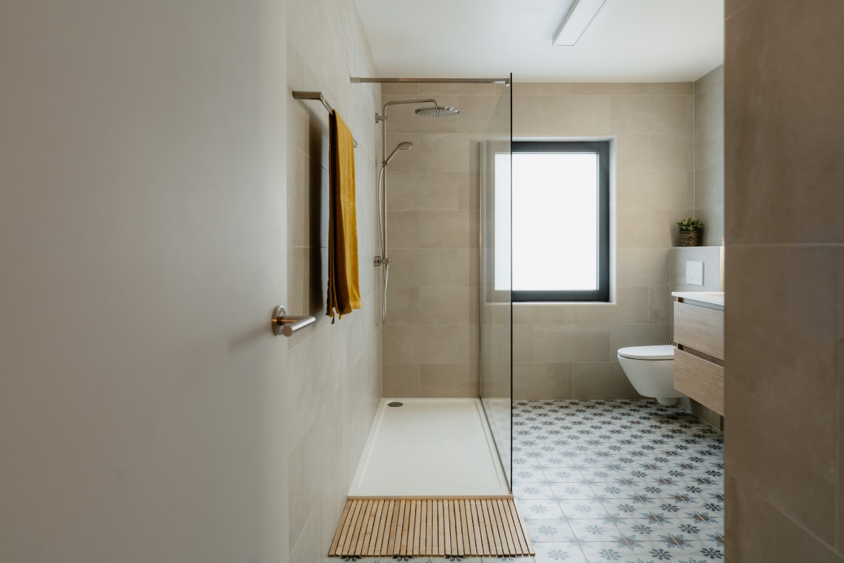 De badkamer werd volledig vernieuwd. “Vroeger was die heel druk, omdat het een vrij kleine ruimte was met een douche én een bad. We wilden meer rust en ruimte en daarom mocht het bad weg. We kozen nu voor een grote inloopdouche. Die is wel ietsje smaller dan standaard omdat alles naast het raam moest passen. Daardoor is de douche volledig op maat gemaakt. Vroeger stond er ook een stenen muur naast het bad, die is nu helemaal weg om ruimte te maken voor de douche. Ook zo krijg je een veel opener gevoel.”