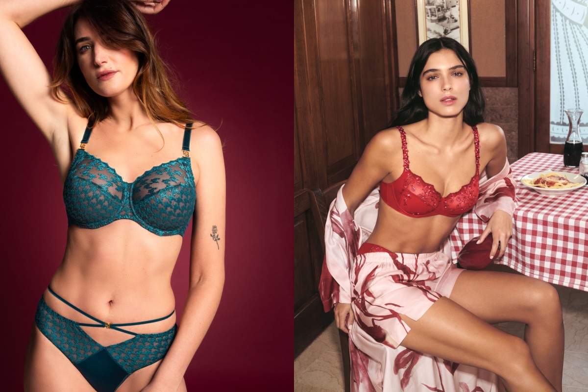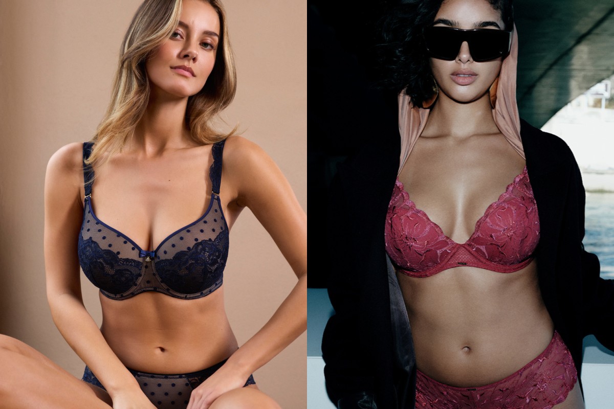Kant is overal aanwezig: subtiele inzetstukken, elegante randjes of volledige lace bodysuits. Moderne kant wordt gecombineerd met microvezel en stretch-tule met glitterapplicaties zodat stukken aantrekkelijk blijven en tegelijk dagelijks draagbaar zijn. Balconettes, plunge- en soft-cup varianten geven vrouwen keuzevrijheid in vorm en gevoel.