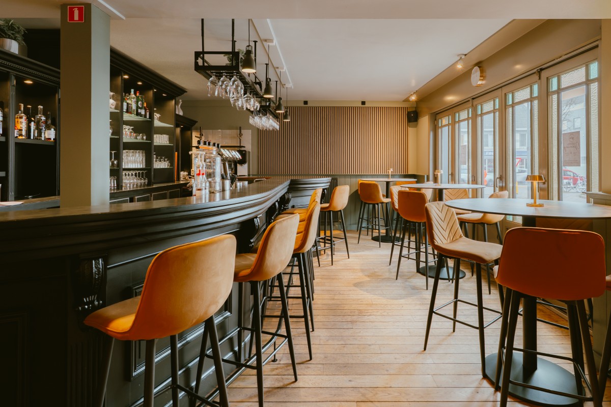 Zo blijft de toog vooraan behouden, al kreeg die wel een likje verf. Aan de straatkant staan verder drie hoge tafels waar je rustig kan zitten. Ook de rest van de zaak is gerenoveerd. “In december zijn we daarmee begonnen”, zegt Kevin. “Daarbij hebben we eigenlijk de volledige zaak onder handen genomen, op de feestzaal na. De toog hebben we in het zwart geschilderd, de vloeren zijn afgeschuurd en vernist. Het interieur is volledig opgefrist en de zaak kreeg nieuw meubilair. En we hebben akoestische houten wandpanelen geplaatst.”