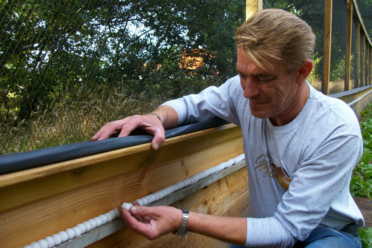 “Egels en vogels, maar die houd ik met houten muurtjes en met netten tegen. Mijn buren hoeven geen schrik te hebben, ontsnappen is onmogelijk voor de slakken. Daar zorg ik wel voor. Kijk maar even! Helemaal rondom liggen allemaal ringetjes van zout. Slakken houden daar absoluut niet van. Als ze ermee in aanraking komen, kruipen ze meteen in hun schulp en tuimelen ze weer naar beneden.”