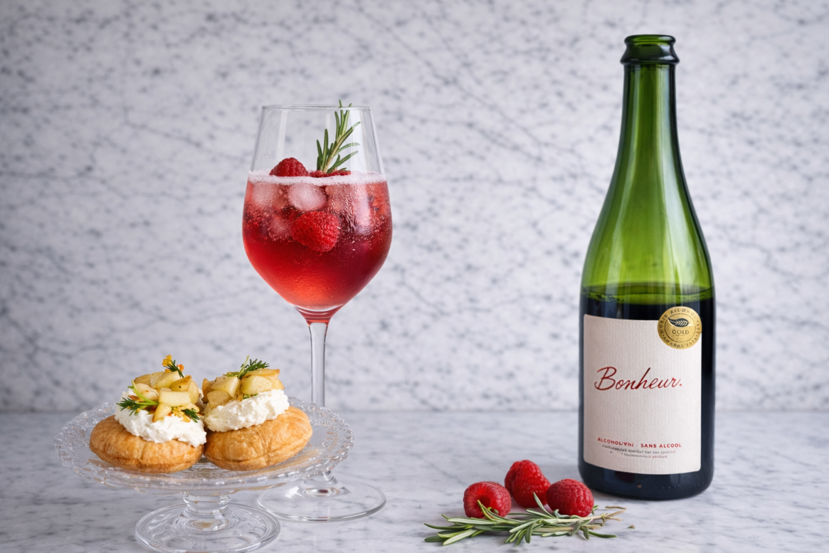Klaartje: “Zelf verzonnen in het kader van Tournée Minérale, dat er in de maand februari aankomt. Het is een fris, aromatisch en gastronomisch aperitief. De combinatie van framboos, vers citroensap en kruidige toetsen versterkt het karakter van onze Bonheur Rosé zonder te overheersen. Daarbij wou ik een licht, verfijnd hapje dat perfect aansluit bij de frisse zuren en kruidige toetsen van die winterse aperitief.”