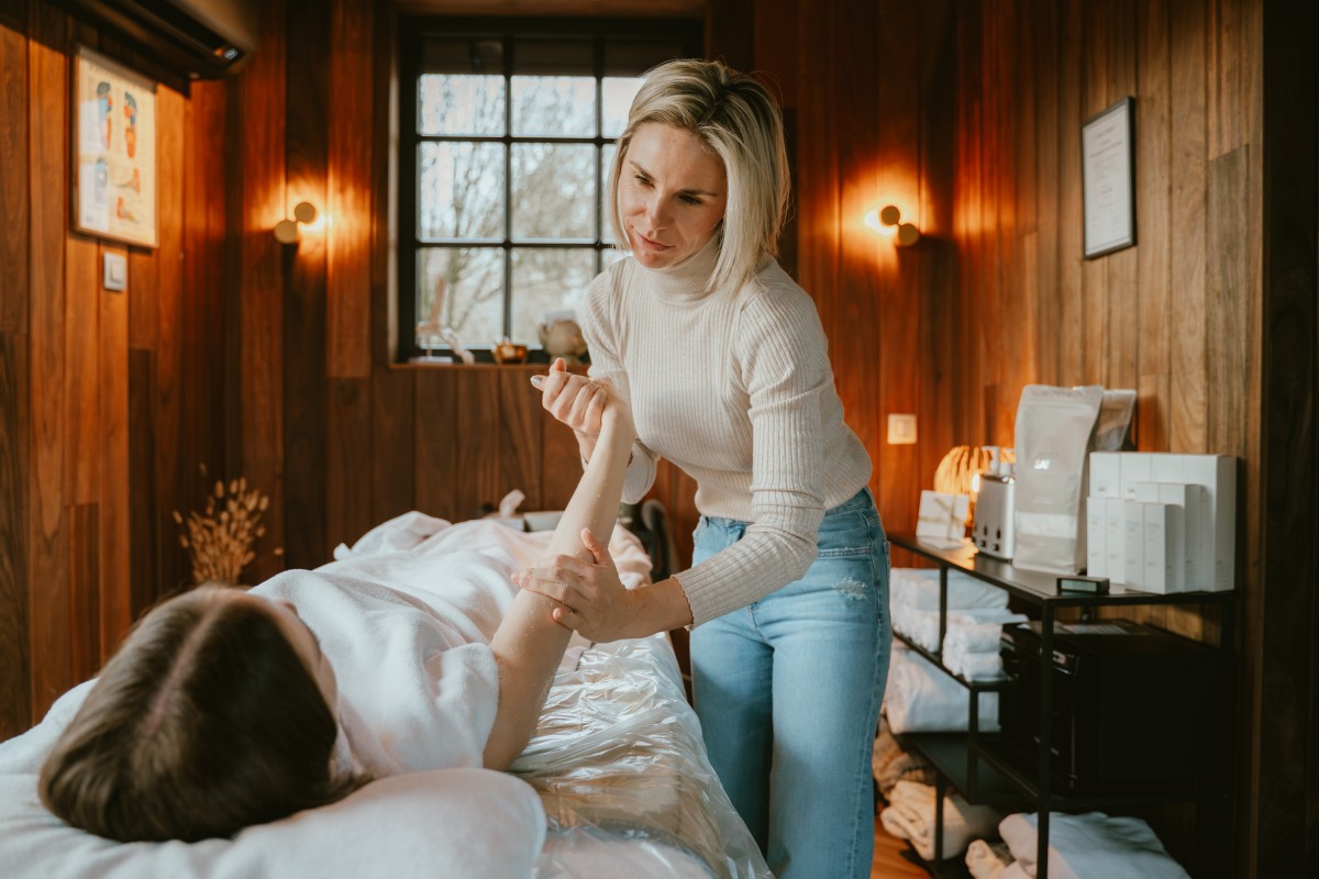 We beginnen met de magnesiumpakking. Tinne scrubt mijn rug, pakt deze in en doet hetzelfde met mijn armen, benen en voeten. Terwijl het magnesium intrekt, voel ik mijn spieren langzaam verzachten, mede door de warmte van het saunadeken. Een heerlijk gevoel. Tegelijkertijd krijg ik een zachte gezichtsmassage. Ik ontspan volledig, alsof mijn lichaam eindelijk kan loslaten wat het al maanden vasthoudt. Tinne legt uit dat magnesium via de huid optimaal wordt opgenomen en helpt bij stress, spanning en overprikkeling van het zenuwstelsel. Ik voel het effect onmiddellijk: mijn ademhaling wordt dieper en mijn lichaam kalmeert. “Dit is geen luxe, dit is zorg voor een systeem dat te lang overbelast was. Daarnaast blijkt het ideaal voor mensen met gewrichts- en spierproblematieken en mensen met een overgevoelige darmflora. Niet iedereen verdraagt magnesium in tabletvorm goed en dan is dit de ideale manier”, vertelt Tinne.